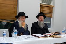 הרב אוברלנדר (מימין) בוחן את תלמידי מכון למען ילמדו בניו יורק, לצד ראש הסניף הרב זושא וילהלם (תשפ"א)