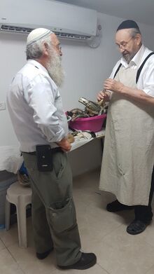 ר' דוד נינצינסקי במפעל השופרות שלו (משמאל)