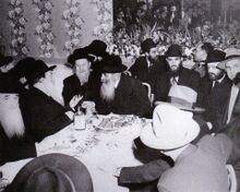 הרבי משתתף בחתונתו של הרב דובוב (יושב מימין לרבי), ז' שבט תש"י