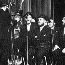 הרב מרטון (משמאל) מנצח על מקהלת חסידים במהלך "ערב חב"ד" שנערך בהיכל התרבות בתל אביב (אדר ב' תש"ל)