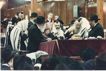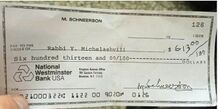 לפני תחילת טקס סיום הספר תורה, נעמד והחזיק את הבקבוק משקה שקיבל מהרבי בשבת שלפני, והכריז שהוא כעת מזמין את הרבי להכנסת ספר תורה. לאחר טקס סיום האותיות שהתקיים ב770, הוציא לו הרבי צ'ק על סך תרי"ג (613) דולר, כהשתתפות, ובצירוף מכתב ברכה מיוחד.