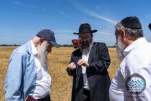 ר' יצי טננבוים יחד עם הרב יוסף ישעיה ברוין והרב יוסי גרליק בעת קצירת חיטים עבור אפיית המצוות (קיץ תשפ"ה) קישור לאתר אנ"ש