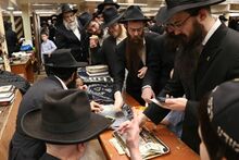 חסידים בתענית אסתר ב-770 פורטים דולרים לשלושה מטבעות של חצאים על מנת לקיים את המנהג זכר למצוות מחצית השקל