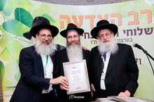 הרב מני שחר (במרכז), מקבל תעודת הוקרה מהרב אמיר הרץ מנהל תלמוד תורה רחובות, והרב נפתלי רוט