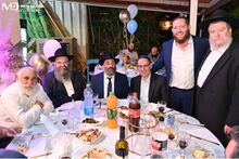 מוישל'ה גוטמן (שני מימין) בחגיגת החלאק'ה של בנו, לצד עסקני כפר חב"ד והרב אליעזר ברוד