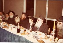 הרב גורלניק נואם בבר מצווה של נכדו. לצידו נראים הרב מרדכי שמואל אשכנזי ור' מענדל פוטרפס