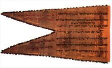 דגל "חיזוק לעניין הגאולה" בבית הכנסת על שם מייזל, עשוי משתי חתיכות בד משי צהוב מיושן. על הדגל רקומים בחוט אדום פסוקי אמונה, תחינה ותקווה לגאולה