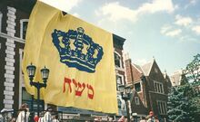 חזית בניין 788 (משמאל ל-770) מעוטרת בכרזות ושלטים בעת תהלוכת ל"ג בעומר תשמ"ז
