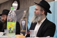 הרב חיים זקלס (מימין) - יחד עם חמיו הרב שמעון אייזנבך - מוסר לראש העיר אילת ספר שכתבה רעייתו (תשע"ה)