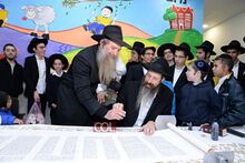 הרב ניצן (במרכז) בהכנסת ספר תורה לישיבה קטנה