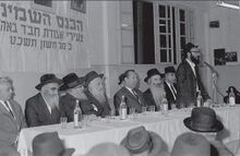 הכינוס הארצי בשנת תשכ"ט. מימין לשמאל: הרב זושא פוזנר (נואם), איש ציבור, הרב דוד חנזין, איש ציבור, הרב בעריש רוזנברג, הרב אברהם קוטנר - רבה של לוד, הרב שרגא מלך קפלן
