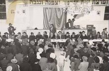 הקהל ושולחן הכבוד בכינוס של שנת תשכ"ג. נראים בשולחן הכבוד: הרב פיניע אלטהויז, הרב שניאור זלמן גרליק, הרב ישראל לייבוב