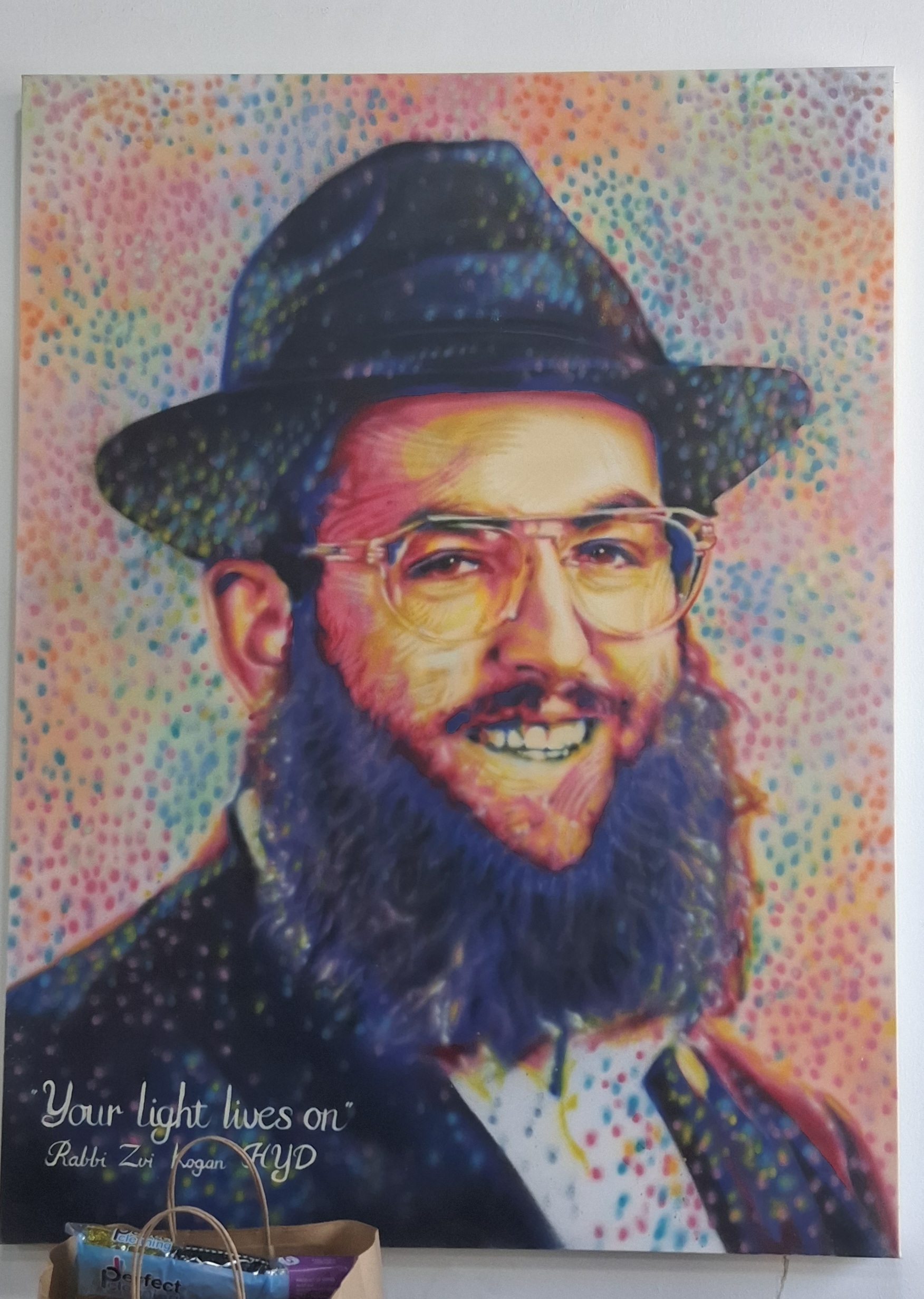 ציור של השליח צבי קוגן הי"ד, המוצב בחנות הכשרה 'רימון' אותה פתח ימים ספורים לפני הרצחו. צולם ע"י מעלה התמונה.